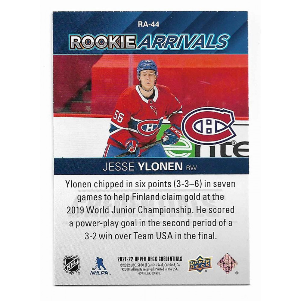 2021-22 Upper Deck Credentials Rookie Arrivals # RA-44 Jesse Ylonen RC