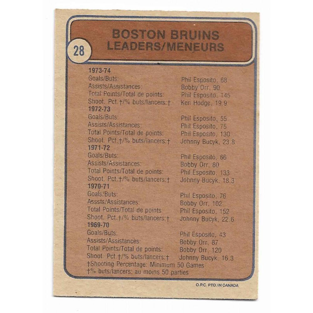 1974-75 O-Pee-Chee # 28 Bruins Team Leaders