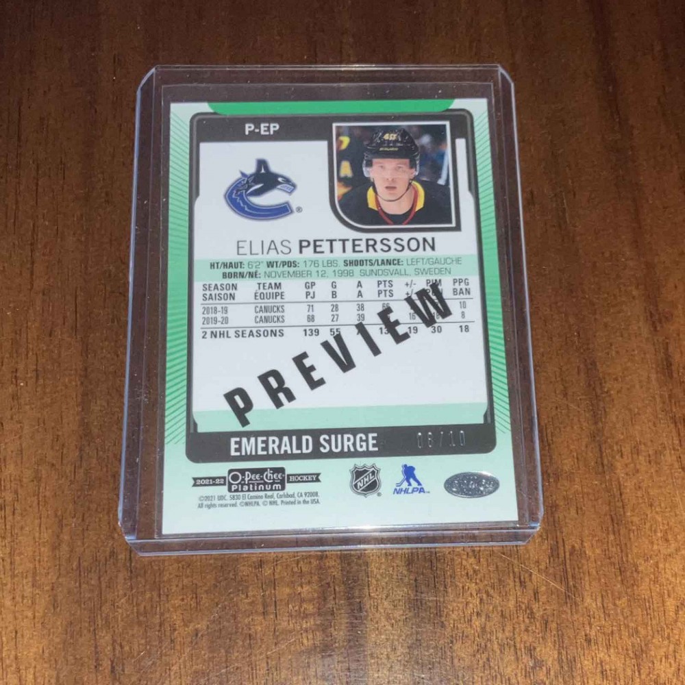 2021-22 O-Pee-Chee Platinum Preview Emerald Surge # P-EP Elias Pettersson /10